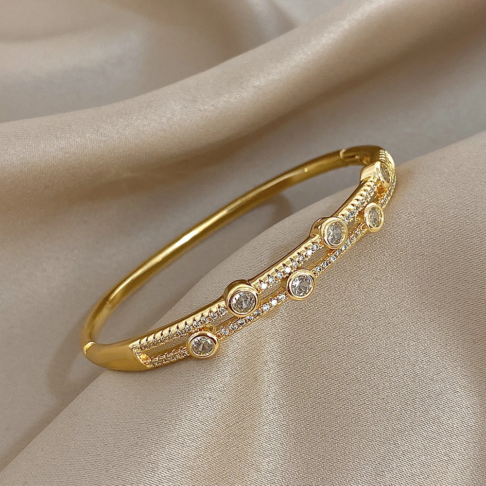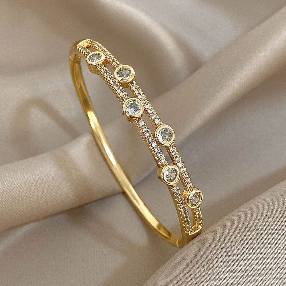 Unique Double Layer Rhinestone Bangle Bracelets for Women Fashion Gold Plated Copper Cuff Bracelet Jewelry Gifts